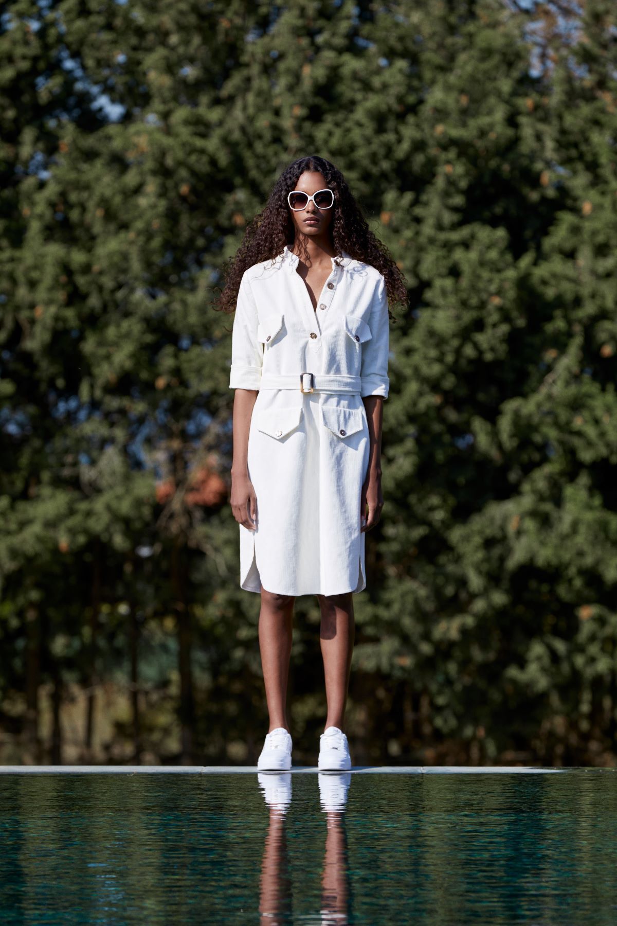 Beyaz Fitilli Kadife Gömlek Elbise