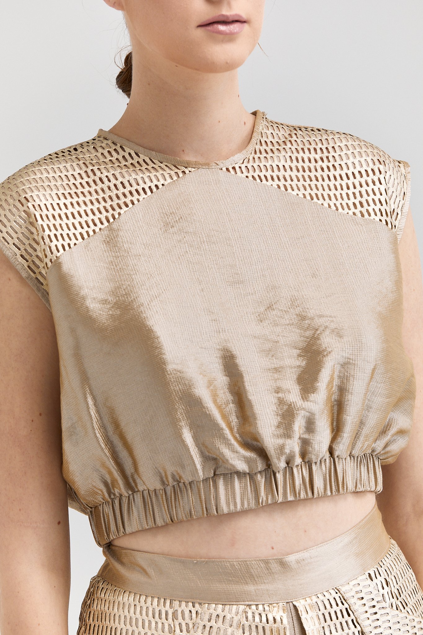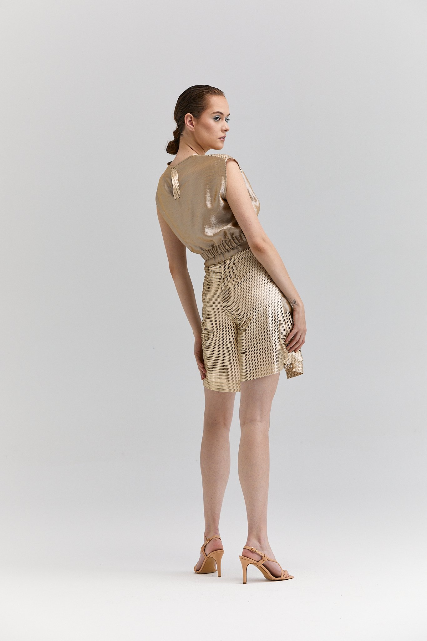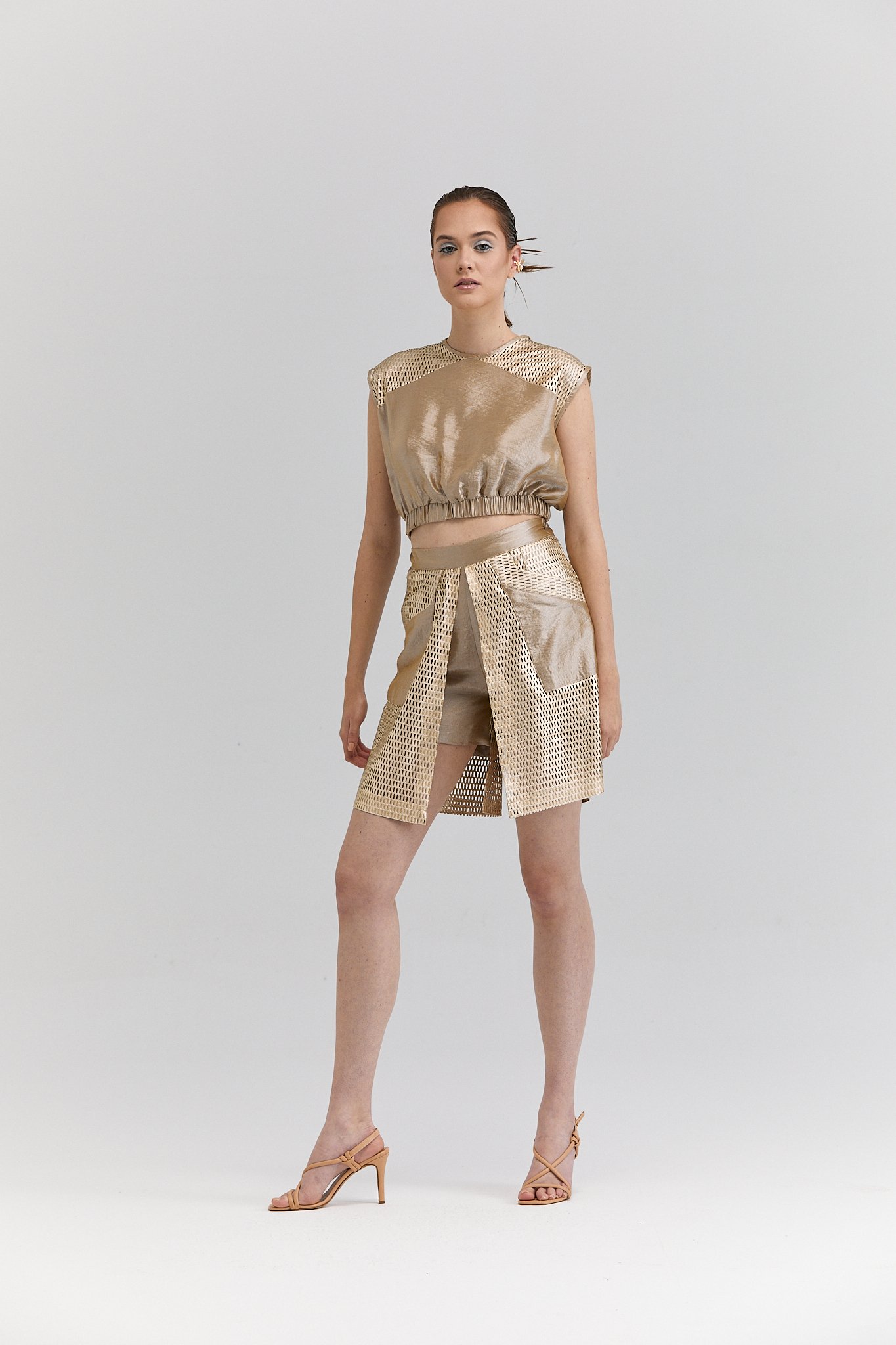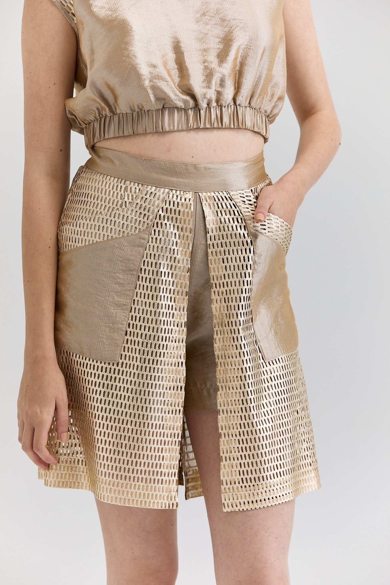 Gold File Detaylı Şort Etek, Gold File Detaylı Balon Bluz, Balon Bluz, Gold Bluz, Fileli Şort, Gold Fileli Takım