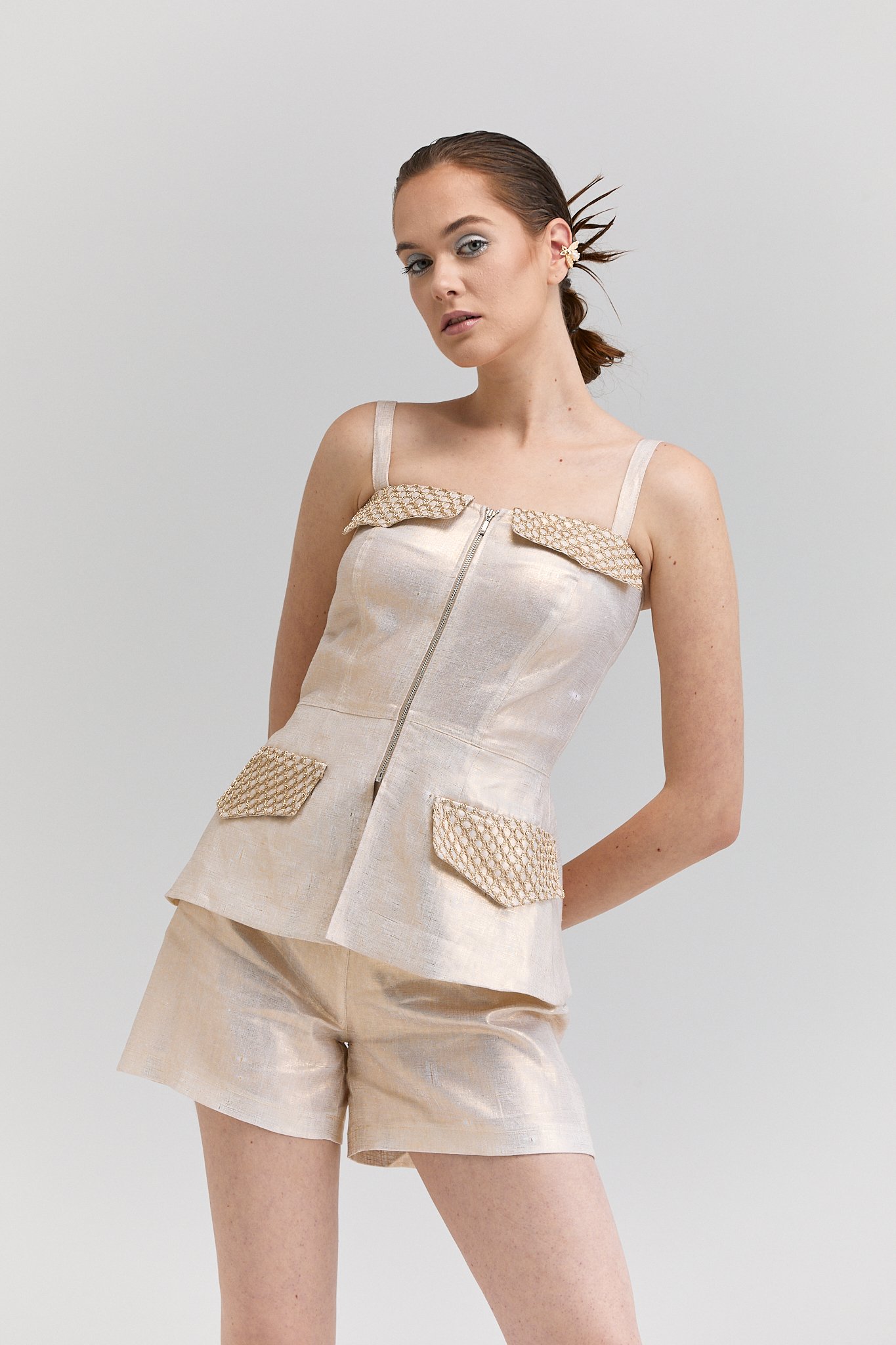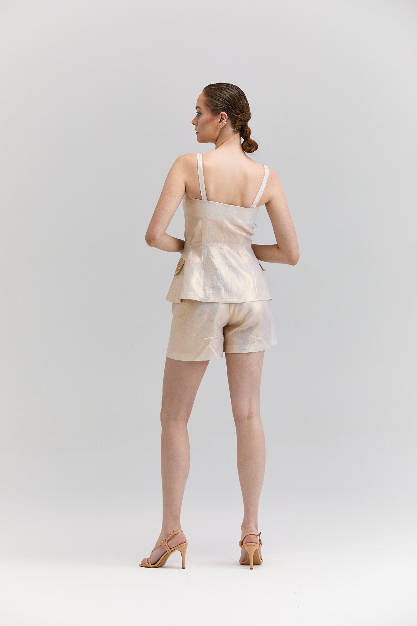 Gold Varaklı Keten Takım, Parlak Bluz, Gold Keten Bluz, Gold Keten Şort, Takım, Yazlık Takım, Cep Detaylı Bluz