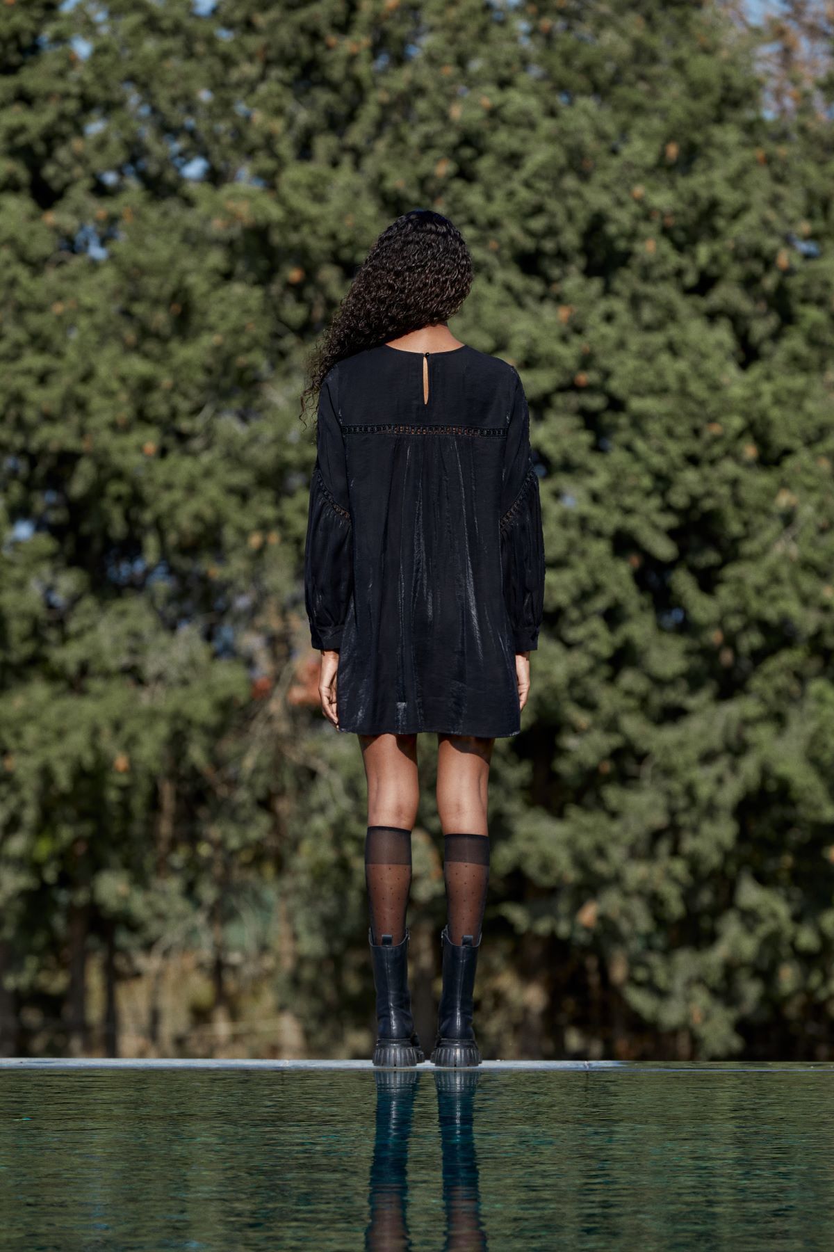 Siyah Parlak Kumaş Dantel Detaylı Elbise